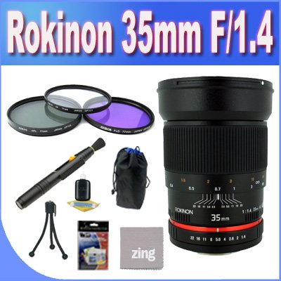 Cheapest Rokinon 35mm F/1.4 AS UMC Wide Angle Lens For Nikon With Automatic Chip RK35MAF-N + 3 Piece Filter Kit + Lens Pouch + Zing Microfiber Cleaning Cloth + Lens Pen Cleaner + Lens Accessory Package